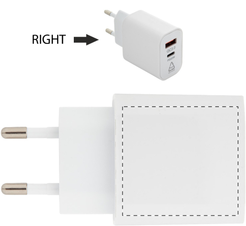 Caricabatterie USB da parete a ricarica rapida in ABS riciclato con 1 porta USB e 1 porta USB-C. Supporta la tecnologia di ricarica rapida (PD20W / QC3.0). Con spina europea a 2 poli