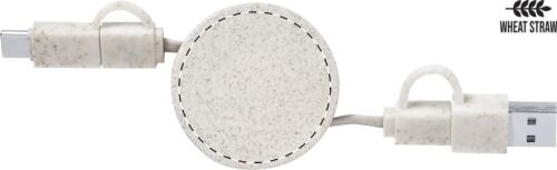 Cavo di alimentazione USB telescopico in plastica ecologica di paglia di grano. Con connettori micro USB, USB-C e Lightning ed ingressi USB e USB-C.