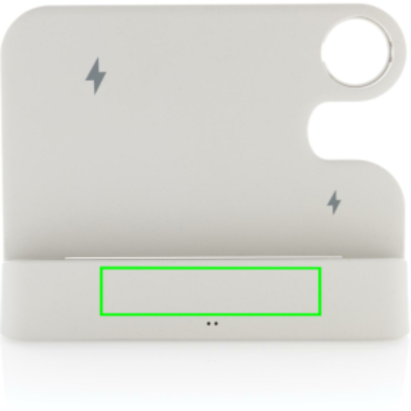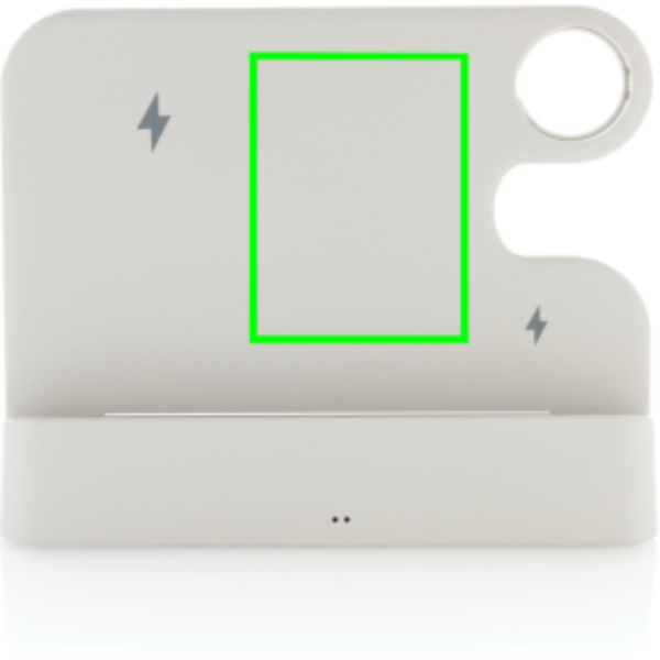 Supporto dal design pieghevole con caricatore wireless da 15W realizzato in ABS riciclato. Include un secondo caricatore wireless da 5W per ricaricare oggetti più piccoli come gli auricolari. Dotato di alloggiamento per iWatch per il cavo di ricarica originale dell'iWatch. Include output USB A e type C da 5V/1A sul retro per caricare oggetti cablati. La base è dotata di gommini in silicone per evitare lo scivolamento e di cuscinetti in silicone per mantenere il telefono in perfette condizioni. Contenuto totale riciclato: 80% in base al peso totale del prodotto. La certificazione RCS garantisce una catena di approvvigionamento di materiali riciclati completamente certificata. Confezionato in scatola FSC®. Senza PVC.