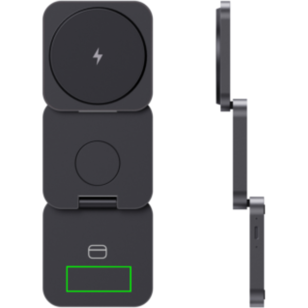 Lussuoso caricatore wireless 3-in-1 pieghevole realizzato in ABS e alluminio riciclato RCS. Contenuto totale riciclato: 46% in base al peso totale del prodotto. La certificazione RCS garantisce una catena di approvvigionamento di materiali riciclati completamente certificata. E' dotato di un caricatore wireless magnetico da 15W e di un caricatore wireless aggiuntivo da 5W adatto alle custodie degli auricolari o ad altri piccoli dispositivi ricaricabili senza fili e di un caricatore wireless da 2,5W per gli smartwatch (solo per gli orologi Apple). Include un cavo in TPE riciclato da 120 cm certificato RCS. Confezionato in scatola FSC® Mix Kraft. Il prodotto e gli accessori sono al 100% privi di PVC. Input: 9V/3A per un utilizzo ottimale. Output: Telefono: 9V/1.1A; 9V/1.67 A/(15W), Auricolari: 5V/1A (5W), Orologio: 5V/0,5A. Senza PVC.