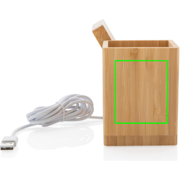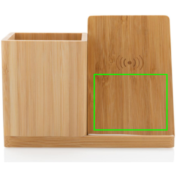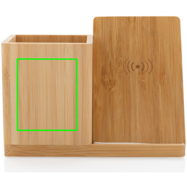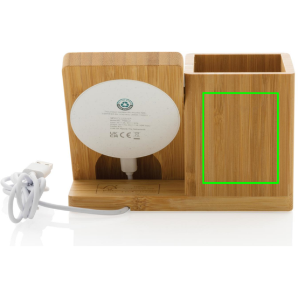 Portapenne e supporto per smartphone realizzato in bambù certificato FSC 100 con caricatore wireless da 10W realizzato con ABS riciclato certificato RCS (Recycled Claim Standard). Contenuto totale riciclato: 6% in base al peso totale dell'articolo (compresa la parte in bambù). Include cavo di ricarica type C da 120 cm in TPE riciclato certificato RCS. Confezionato in scatola FSC mix. Input type C 5V/2A; 9V/1.67A. Output wireless 5V/1A;9V/1.1A (10W). Design registrato®