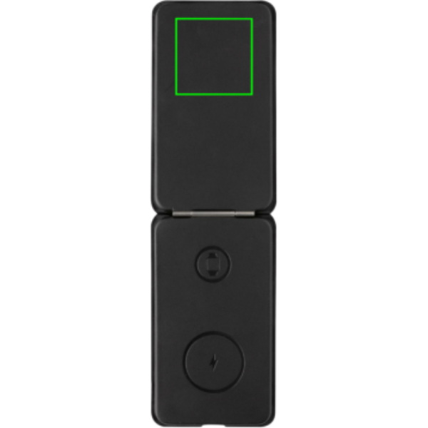 Caricabatterie wireless 3 in 1 elegante e pieghevole, realizzato in PU riciclato certificato RCS. Contenuto riciclato totale: 5% in base al peso totale dell'articolo. La certificazione RCS garantisce una catena di approvvigionamento dei materiali riciclati completamente certificata. E' dotato di un caricabatterie wireless magnetico da 15W sulla parte anteriore. Sul retro è presente un caricatore wireless aggiuntivo da 5W adatto alle custodie degli auricolari o ad altri piccoli dispositivi ricaricabili in modalità wireless e un caricatore wireless da 2,5W per gli smartwatch (solo per gli orologi Apple). Confezionato in scatola kraft FSC® mix. Articolo e accessori 100% senza PVC. Input: 9V/3A per un utilizzo ottimale. Output: Anteriore: 9V/1.1A; 9V/1.67 A/(15W), Auricolari: 5V/1A (5W), Orologio: 5V/0,5A.