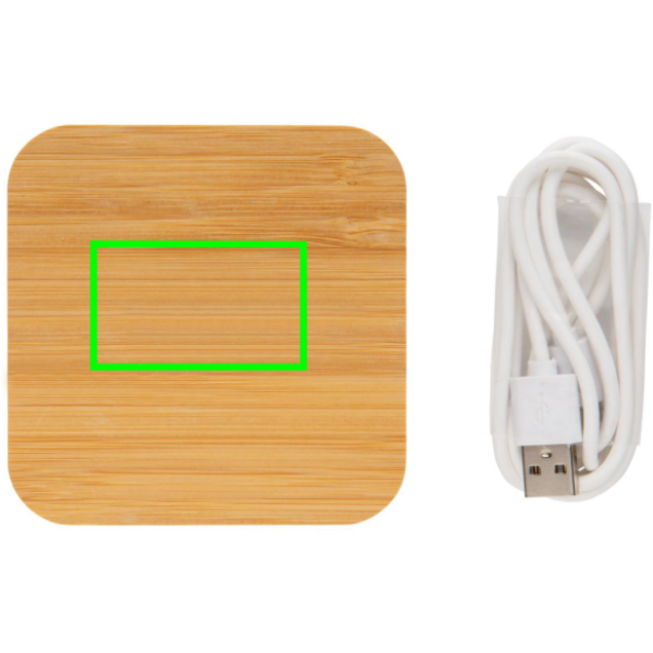 Caricatore wireless da 5W realizzato in bambù certificato FSC al 100% con due porte USB integrate. Include cavo micro USB in TPE da 150 cm. Compatibile con tutti i dispositivi abilitati QI come Android di ultima generazione, iPhone 8 e versioni successive. Input: 5V/2A; Output USB, 5V/2A; output wireless: 5V/1A - 5W. Articolo e accessori 100% senza PVC. Confezionato in scatolina FSC mix.