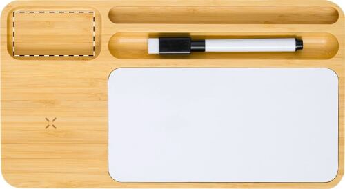 Organizer da scrivania in bambù con portacellulare, superficie per scrivere cancellabile e caricatore rapido wireless integrato (15W). Pennarello con gomma e cavo di ricarica USB inclusi.