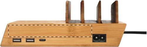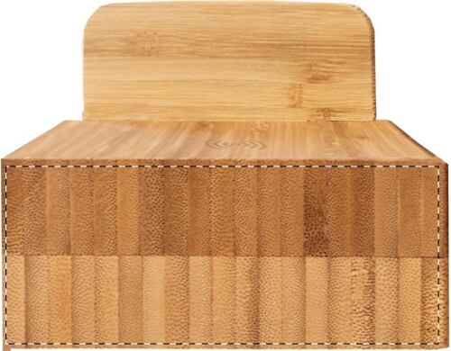 Stazione di ricarica USB in bambù con supporti per cellulari e caricatore veloce wireless incorporato (10W). Con 2 porte USB e 1 porta di ricarica USB-C. Incluso il cavo di ricarica AC.