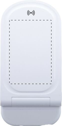Supporto per cellulare da scrivania, in plastica ABS riciclata, pieghevole e regolabile, con caricatore rapido wireless integrato (15W) e cavo di ricarica USB incluso.