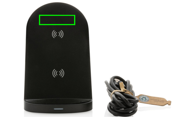 Supporto per caricabatterie rapido wireless da15W con due bobine di ricarica integrate. Ricarica sia in orizzontale che verticale. Realizzato con materiali riciclati certificati RCS (Recycled Claim Standard). Contenuto totale riciclato: 56% in base al peso totale dell'articolo. La certificazione RCS garantisce una filiera completamente certificata dei materiali riciclati. Include cavo di ricarica da 150 cm in TPE riciclato senza PVC. Sia l'articolo che gli accessori sono 100% senza PVC. Confezionato in scatola FSC mix. Ricarica wireless compatibile con Android di ultima generazione, iPhone 8 e versioni successive. Input12 V/1,67 A. Output wireless: 9 V/1,5 A 15 W.