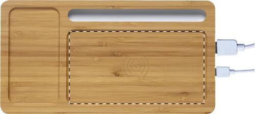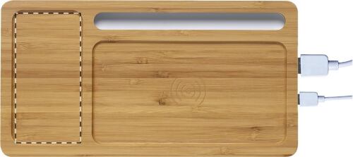 Svuota tasche da scrivania in bambù e porta cellulare con caricatore wireless integrato (5W). Con porta caricabatterie USB per la ricarica simultanea di 2 dispositivi (1 senza fili e 1 via cavo). Uscita massima: 1000 mA. Cavo di ricarica USB incluso.