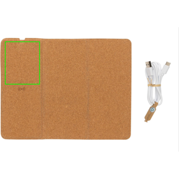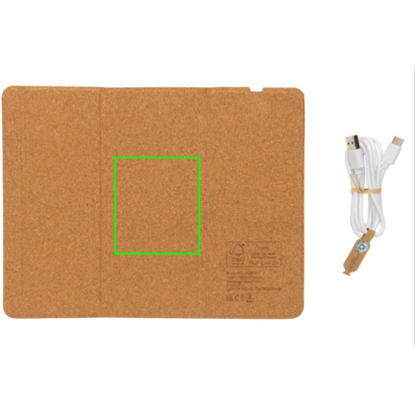 Tappetino per mouse con ricarica wireless da 10W in sughero FSC 100%. Può essere utilizzato sia come tappetino per mouse che come supporto per telefono. Ricarica wireless compatibile con tutti i dispositivi abilitati QI come Android di ultima generazione, iPhone 8 e versioni successive. Compreso di cavo di ricarica di type C da 120 cm in TPE riciclato certificato RCS. Confezionato in scatola FSC® mix. Type C in; 9V/2A; Output wireless 9V/1,1A (10W).
