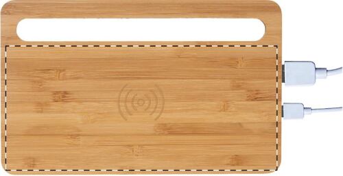 Organizer da tavolo in bambù e porta cellulare con caricatore wireless integrato (5W). Con porta USB per la ricarica simultanea di 2 dispositivi (1 wireless e 1 via cavo). Uscita massima: 1000 mA. Cavo di ricarica USB incluso.