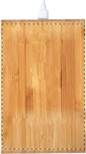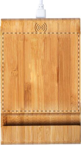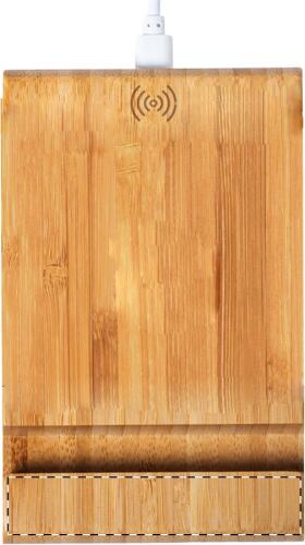 Supporto per cellulare da scrivania in bambù con caricatore rapido wireless integrato (15W) e cavo ricarica USB incluso.