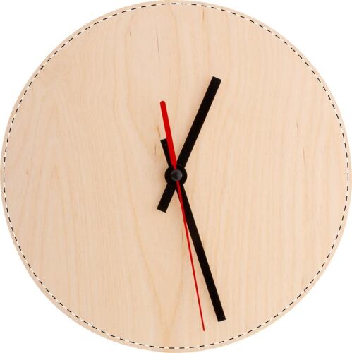 Orologio da parete in compensato di betulla di forma rotonda e grafica personalizzata. Funziona con 1 batteria AA, non fornita. MOQ: 50 pezzi.