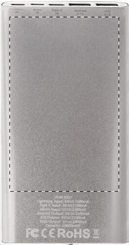 USB power bank con batteria da 10000 mAh, corpo in alluminio con 2 uscite USB e 2 uscite USB-C. Cavo di ricarica non fornito.