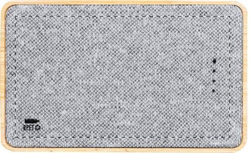 Power bank in bambù con parte superiore in tessuto di poliestere RPET, batteria da 5000 mAh, porta di ingresso USB-C, e 2 porte di ricarica USB e 1 USB-C. Cavo di ricarica USB incluso.