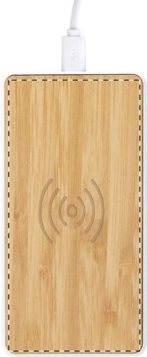 Power bank USB da 8000 mAh con copertura in bambù e caricabatterie wireless integrato (5W). 2 porte USB e 1 di USB-C. Il power bank può essere caricato attraverso le porte micro USB e USB-C. Cavo di ricarica USB incluso.