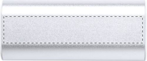 Power bank in alluminio con batteria da 2200 mAh., porta di ricarica USB e porta di ingresso micro USB. Cavo di ricarica USB incluso.