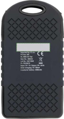 Power bank solare in ABS con rivestimento gommato, include luci LED indicatrici verdi e torcia laterale integrata, dotato di due porte USB, una porta USB-C, ricarica solare 5V/200mA, ingresso DC 5V/1A e uscita DC 5V/2x1A, capacità di 4.000 mAh, cavo USB incluso.