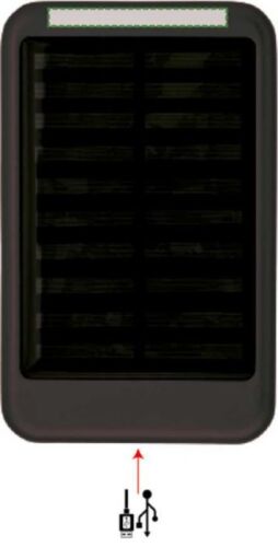Power bank solare in alluminio con luci LED indicatrici blu, dotato di porte USB e USB-C, con ingresso DC 5V/1A e uscita 5V/1A, capacità di 4.000 mAh, cavo USB incluso.