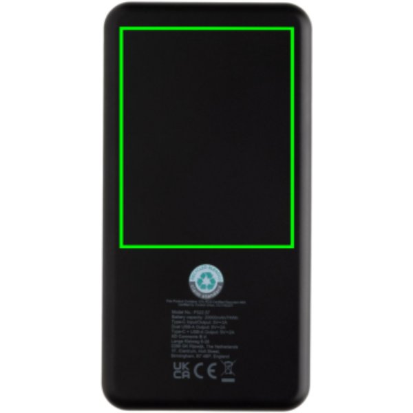 Powerbank da 20.000 mAh con porta di ingresso/uscita type C e 2 porte USB A aggiuntive. Questa powerbank può caricare tre oggetti contemporaneamente. La custodia è realizzata in plastica ABS riciclata certificata RCS. RCS (Recycled Claim Standard) è uno standard per verificare il contenuto riciclato di un prodotto lungo l'intera catena di fornitura. Contenuto riciclato totale: 12% in base al peso totale dell'articolo. Quando è completamente carica, la powerbank fornisce energia sufficiente per ricaricare il telefono cellulare fino a otto volte. La powerbank contiene una batteria ai polimeri di litio di grado A da 20.000 mAh a lunga durata. Gli indicatori di potenza indicano il livello di energia rimanente, in modo da sapere sempre quando ricaricare. Input type-C 5V/2.4A; USB A: output 5V/2.4A, type C output: 5V/2A Articolo e accessori privi di PVC. Incluso cavo di ricarica in TPE riciclato certificato RCS. Imballato in una confezione FSC® mix.