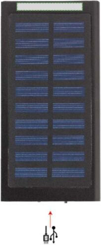 Powerbank solare in alluminio ed ABS, capacità 8.000 mAh, input DC5V/1A, output DC5V/1A e DC5V/2.1A, include porta USB, cavo per la ricarica USB/Micro USB, adatto per la maggior parte dei device in commercio