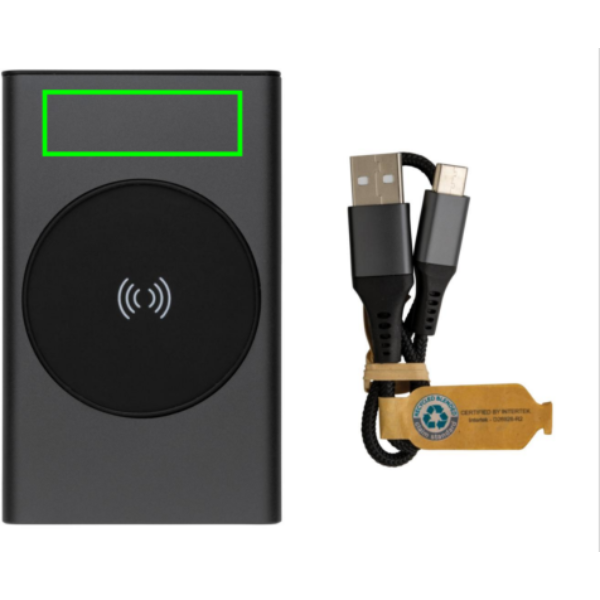 Powerbank realizzata con alluminio riciclato certificato RCS (Recycled Claim Standard) e ABS. Contenuto totale riciclato: 31% in base al peso totale dell'articolo. La certificazione RCS garantisce una filiera completamente certificata dei materiali riciclati. L'alluminio non perde le sue caratteristiche nel processo di riciclaggio e può essere riciclato all'infinito. La powerbank contiene una batteria ai polimeri di litio di grado A da 5000 mAh di lunga durata. Il caricabatterie wireless supporta la ricarica wireless fino a 5W. Gli indicatori di alimentazione segnalano il livello di energia rimanente in modo da sapere sempre quando ricaricare. Articolo e accessori 100% senza PVC. Include cavo di ricarica type C in alluminio riciclato certificato RCS, TPE e PET. Confezionato in scatola FSC® mix. Output USB 5/2,4 A, output type C: 5 V/2,4 A. Input type C: 2,4 A. Input micro USB: 5 V/2 A.