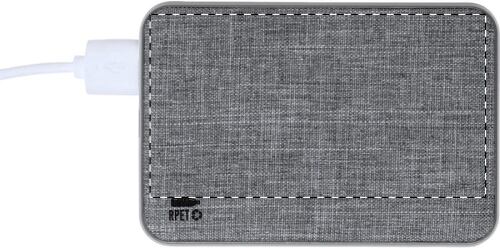 USB power bank in plastica RPET con parte anteriore in tessuto di poliestere RPET. Batteria da 5000 mAh, 2 porte di ricarica USB e 1 USB-C. Porte di ingresso Micro USB e USB-C. Incluso il cavo di ricarica USB.