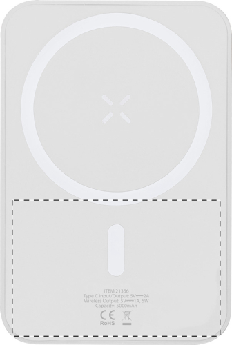 Power bank in plastica ABS con batteria da 5000 mAh e caricatore wireless magnetico integrato (5W). Con ingresso USB-C e porta di ricarica. Compatibile con iPhone® 12 o più recente. Cavo di ricarica USB incluso.