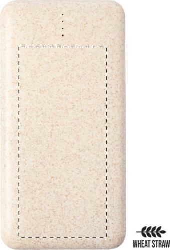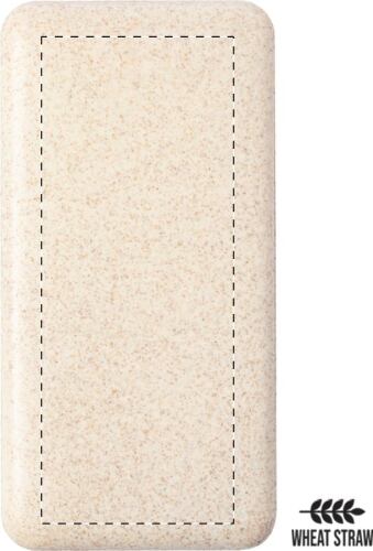 Power bank in plastica ecologica di paglia di grano con batteria da 8000 mAh, caricatore rapido wireless integrato (10W), porta di ingresso USB-C e 2 porte di ricarica USB e 1 USB-C. Cavo di ricarica USB incluso.