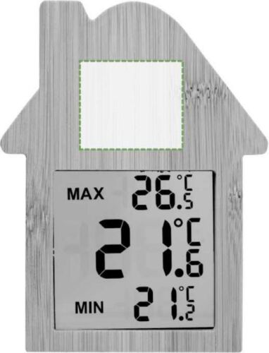 Stazione meteorologica in bambù a forma di casa, con ventosa sul retro, ideale per monitorare la termperatura interna della casa, display in LED che indica la temperatura attuale, la temperatura minima e temperatura massima, batterie incluse, confezionata singolarmente in una scatola in cartone avana