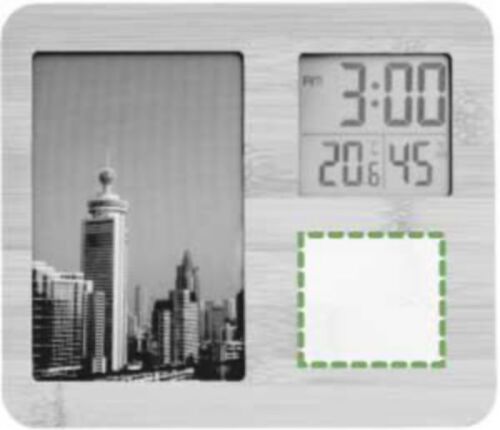 Stazione meteorologica in bambù con cornice per foto, diverse funzioni come orologio, temperatura e umidità, batterie incluse. Dimensioni della foto 15 x 10 cm.