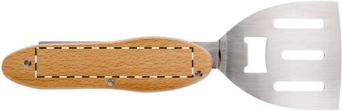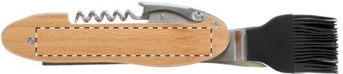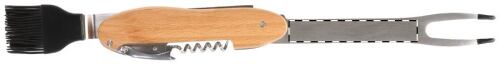 Utensile multiuso 5 in 1 per barbecue con manico in legno, composto da spatola, forchettone, pennello, apribottiglie e cavatappi. Si divide in 2 utensili distinti attraverso un sistema scorrevole.