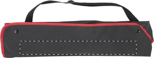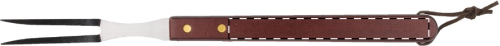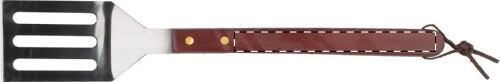 Set da barbecue da 5 pezzi con 3 accessori in acciaio inox (forchettone, pala e clip) con manico in legno, un guanto e un grembiule in poliestere.