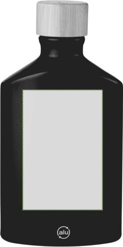 Borraccia in alluminio riciclato a forma di fiaschetta, include tappo in bambù con moschettone, confezionato singolarmente in una scatola in cartone avana, include logo “alluminio riciclato” inciso, capacità 500 ml