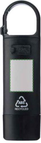 Mini torcia in ABS riciclato con batteria ricaricabile, USB integrata da 200 mAh e moschettone. Dotata di luce frontale COB e luce laterale COB, con tre modalità di illuminazione. Include cavo di ricarica USB-C e logo “ABS riciclato”, confezionata singolarmente in una scatola di cartone avana.