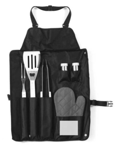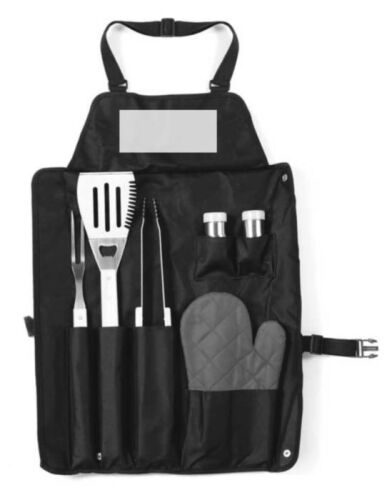 Set da barbecue composta da 6 elementi in acciaio inox, include grembiule in nylon 600 D in colore nero, forchettone, spatola, pinza e set sale e pepe