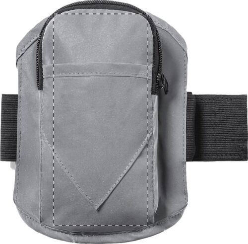 Fascia riflettente da braccio con scomparto e cerniera. Può essere utilizzato per trasportare un telefono cellulare, chiavi, contanti o carte di credito. Poliestere 210T.