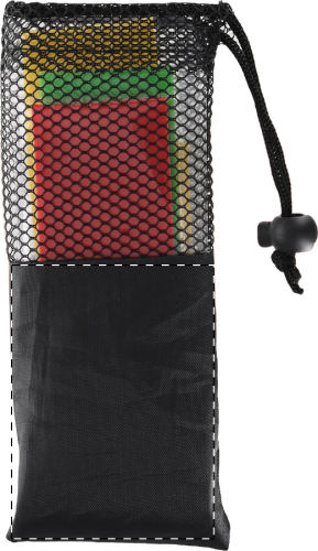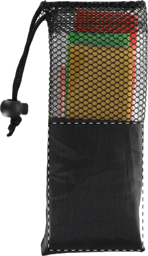 Set 3 fasce fitness elastiche in gomma TPE con diversa resistenza (leggera, media, forte). Sacchetto con chiusura a coulisse compreso.