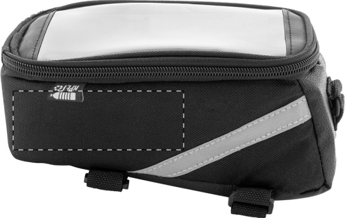 Borsa in poliestere 600D RPET per il telaio della bicicletta con scomparto chiuso da cerniera, tasca portacellulare touchscreen, cinghie regolabili in velcro, striscia riflettente ed etichetta RPET.
