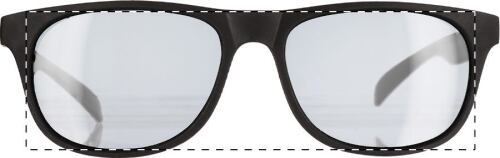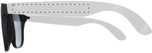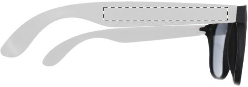 Occhiali da sole in plastica con montatura nera e stanghette colorate. Protezione UV400.