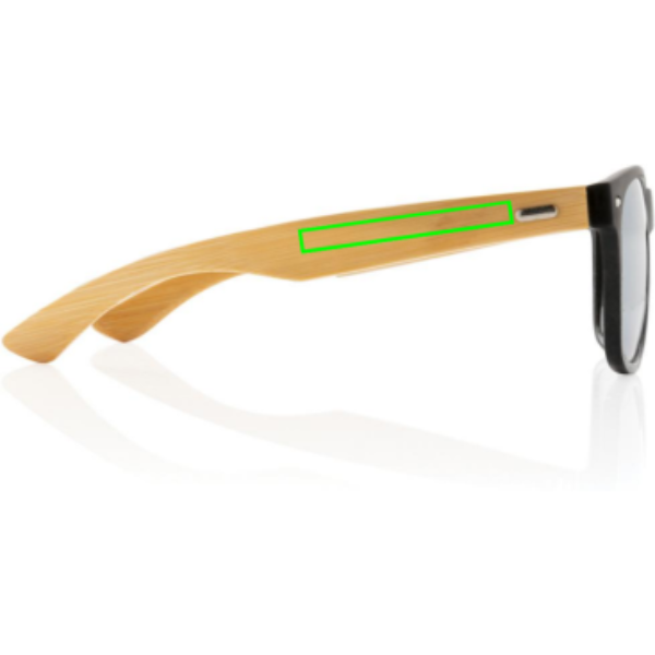 Occhiali da sole realizzati con montatura in PC riciclato certificato RCS e stecche in bambù FSC® 100%. Il contenuto riciclato del telaio è al 100%. Contenuto totale riciclato: 41% in base al peso totale dell'articolo. La certificazione RCS garantisce una filiera completamente certificata dei materiali riciclati. Le lenti sono in acrilico smokey e sono conformi a EN ISO 12312-1, UV 400 e CAT 3. Confezionate in scatola FSC®.