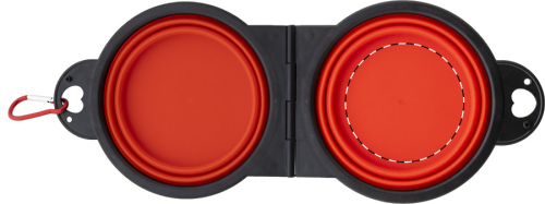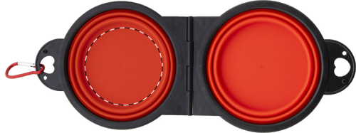 Ciotola pieghevole in resistente TPE con due scomparti da 450 ml e moschettone in alluminio in colore coordinato.