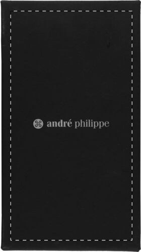 Cintura in pelle da uomo con 2 fibbie in metallo intercambiabili. Confezione: scatola in elegante cartoncino nero (205 × 115 mm). Prodotto André Philippe.