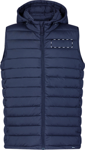 Gilet invernale in 100% poliestere RPET resistente all'acqua e al vento, con tasche laterali chiuse da cerniera, cappuccio regolabile ed etichetta RPET. Completo di sacchetto in poliestere RPET.