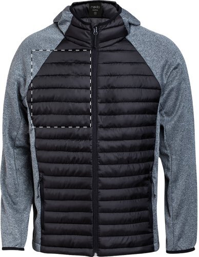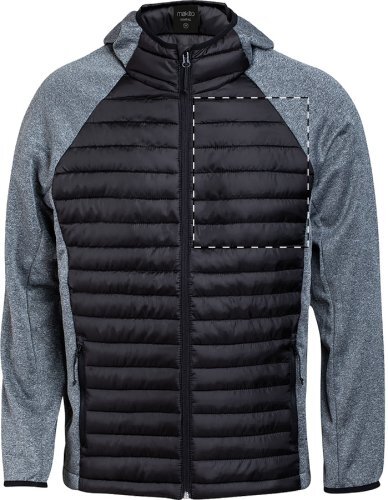 Giacca traspirante in combinazione softshell-poliestere, resistente all'acqua e al vento, con cappuccio e tasche laterali con cerniera.