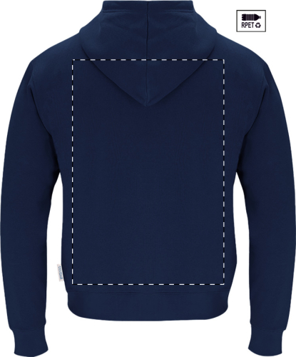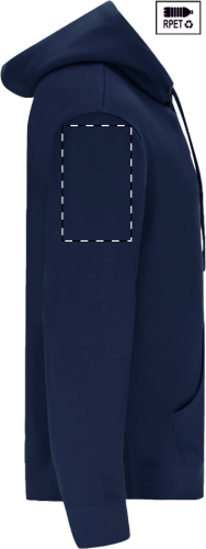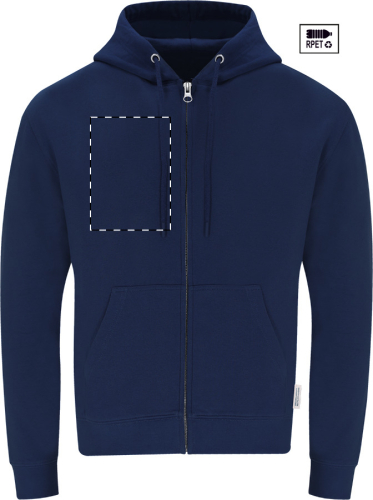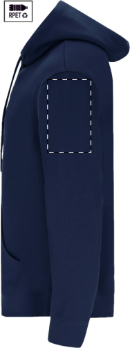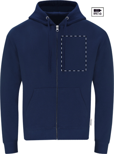 Felpa da 280 g/m2 con cappuccio, tasca frontale e zip, in 60% cotone organico e 40% poliestere RPET.