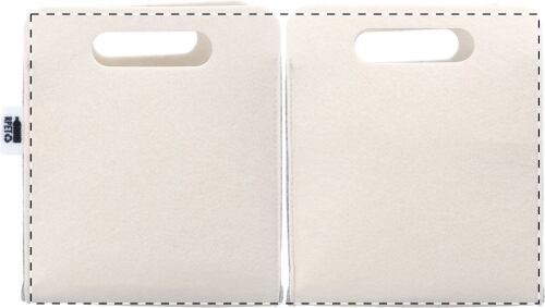 Contenitore organizer da scrivania in feltro RPET, con grafica stampata a colori, manici fustellati ed etichetta RPET. Il costo comprende la stampa in sublimazione. MOQ: 50 pezzi.