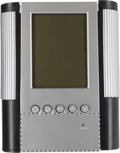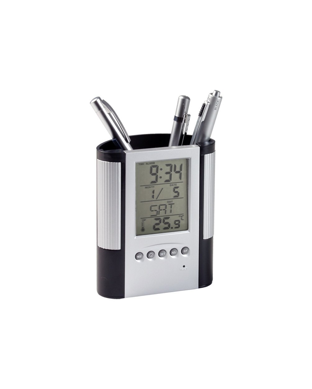 Portapenne in plastica con display digitale, termometro, orologio, sveglia e calendario. Consegnato con batteria a bottone.