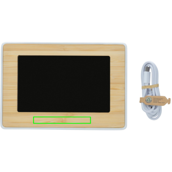 Orologio realizzato con ABS riciclato certificato RCS (Recycled Claim Standard) e bambù 100% FSC®. Contenuto totale riciclato: 76% in base al peso totale dell'articolo. La certificazione RCS garantisce una filiera completamente certificata dei materiali riciclati. Con schermo LED di alta qualità. Funzioni: orologio, sveglia, calendario, temperatura, opzione 12/24 ore, Fahrenheit/Celsius. Include cavo di ricarica di type C da 100 cm in TPE riciclato certificato RCS. Confezionato in scatola FSC® mix.