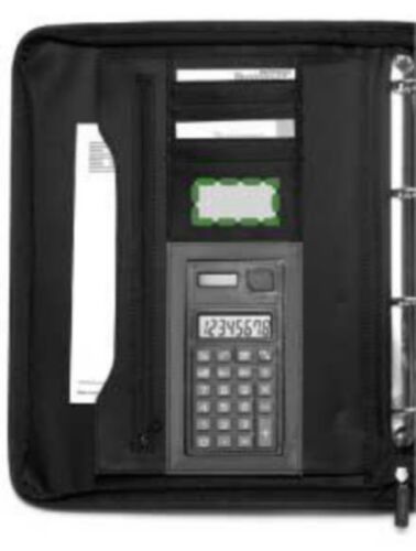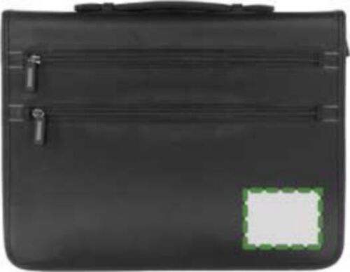 Portablocco formato +/- A4, manico retrattile, vari scomparti interni ed esterni, chiusure lampo, calcolatrice 8 cifre, raccoglitore a 4 anelli, passante porta penna, blocco incluso, in poliestere