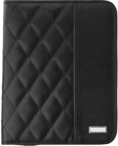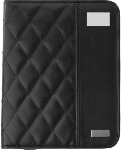 Portablocco formato +/- A4 con targhetta in metallo personalizzabile ad incisione laser, vano porta carta di credito, passante elasticizzato per penna, blocco con pagine a righe, PU imbottito